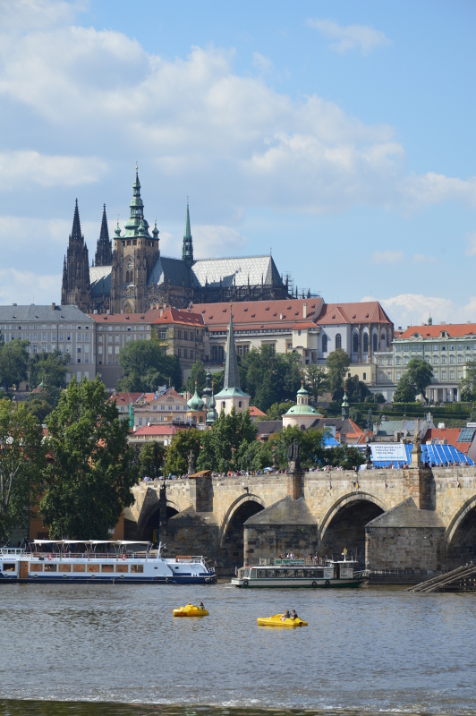 After I unpacked, I got the camera gear and merged into the massive throng of tourists headed to the Charles Bridge. The Charles Bridge is a landmark historic bridge that crosses the Vltava river in Prague, Czech Republic. Its construction started in 1357 under during the reign of King Charles IV. It is over 600 m long and almost 10 m wide. It is guarded by 30 statues (15 to a side) and 3 guard towers.