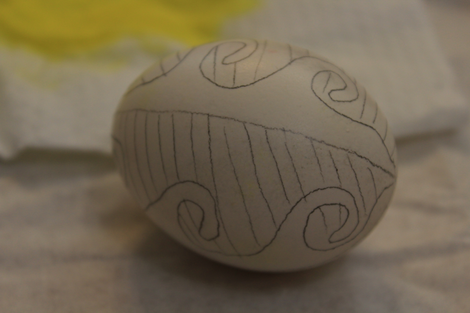 Well, painted is a misnomer anyway because the eggs are not really painted..They are created by drawing the designs with wax and then soaking them in dye.. It is called the “wax-resist” method or batik.  Some people just start with wax and draw the design but, as novices, we drew ours with a pencil first..