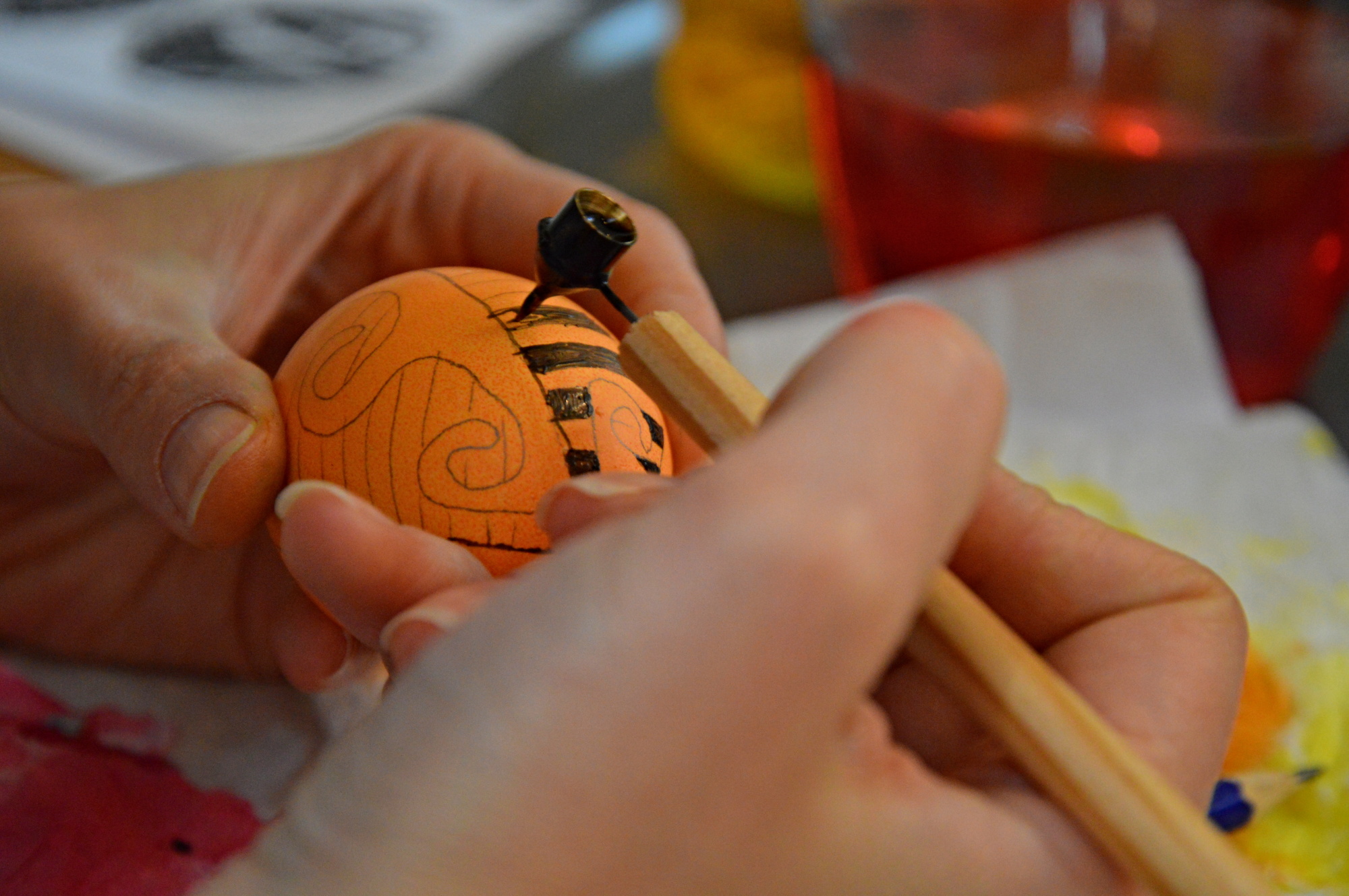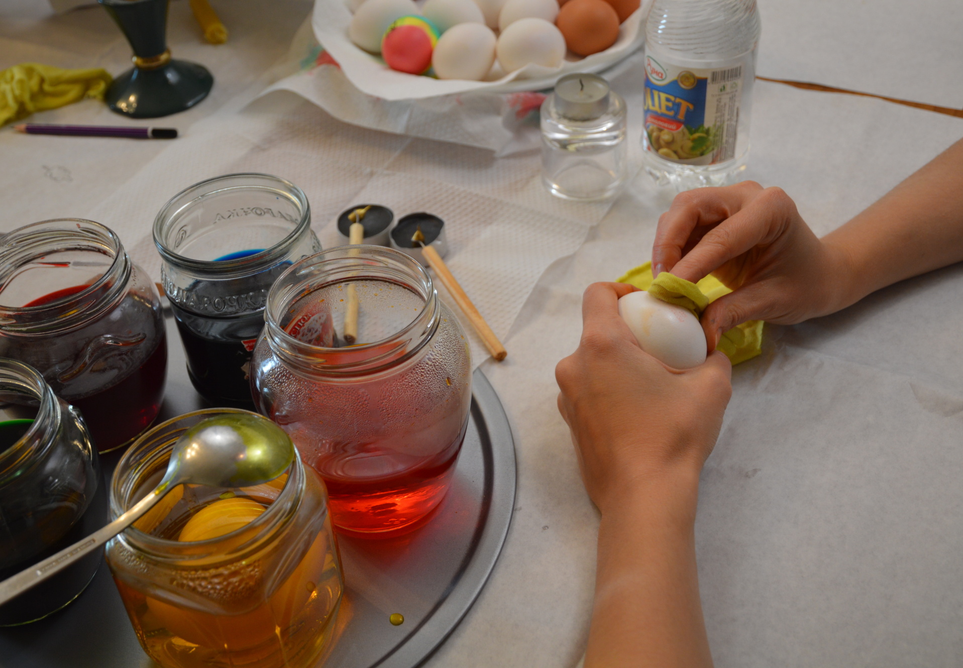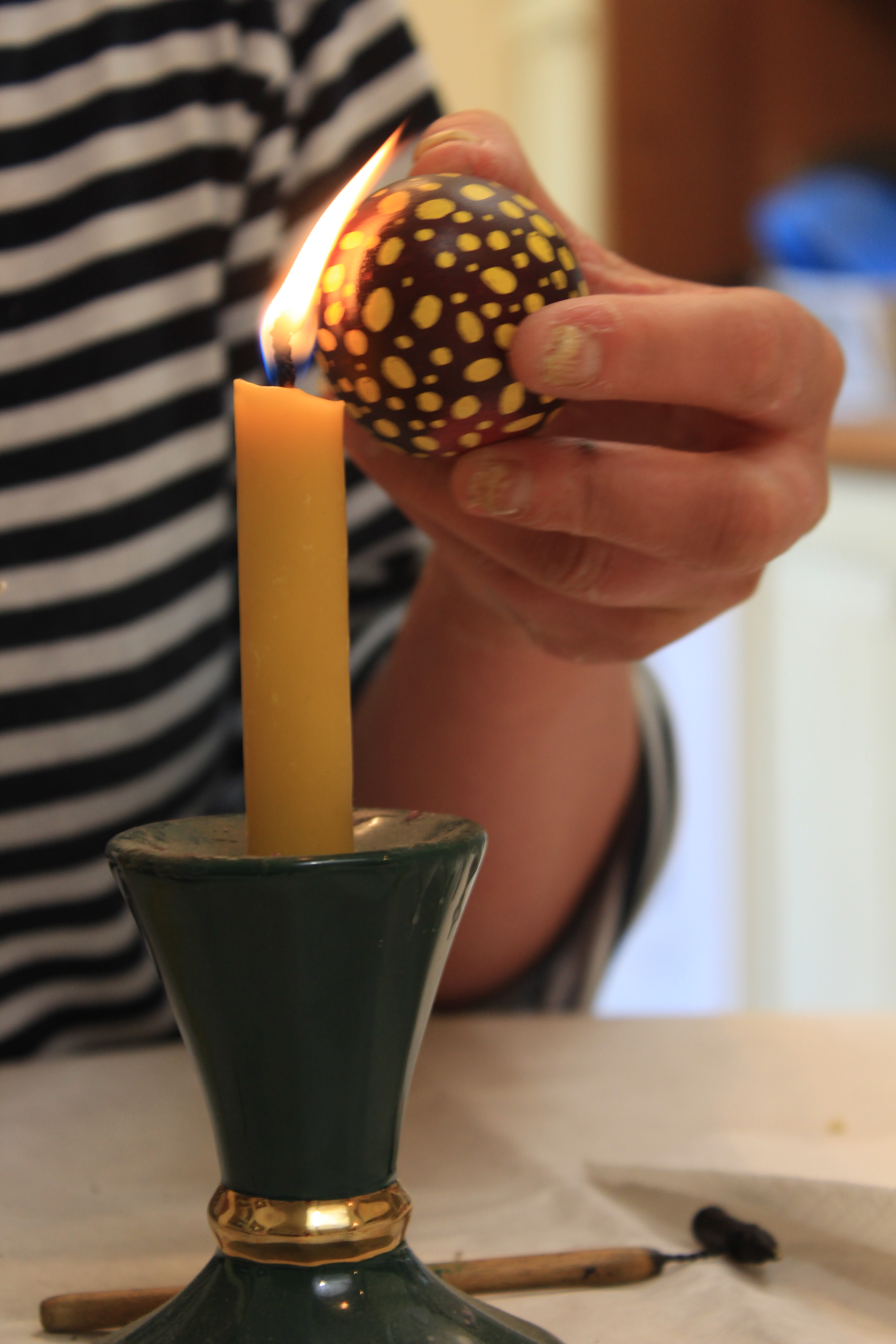 Areas of your egg that you want to remain that color are then waxed over before being soaked in a different color dye